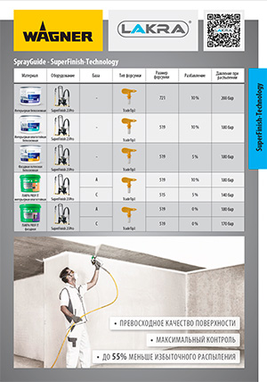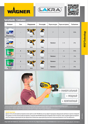 Каждый лакокрасочный продукт от ЛАКРА прошел испытания на профессиональном оборудовании компании Wagner — лидера в области технологий по нанесению настенных покрытий методом распыления (HEA и др.). Специалисты компании составили SprayGuide – рекомендации по подбору инструментов для распыления красок ЛАКРА. Эта инструкция обеспечит малярам легкость в работе с продуктом, а конечным клиентам — долговечное покрытие с превосходными визуальными характеристиками.